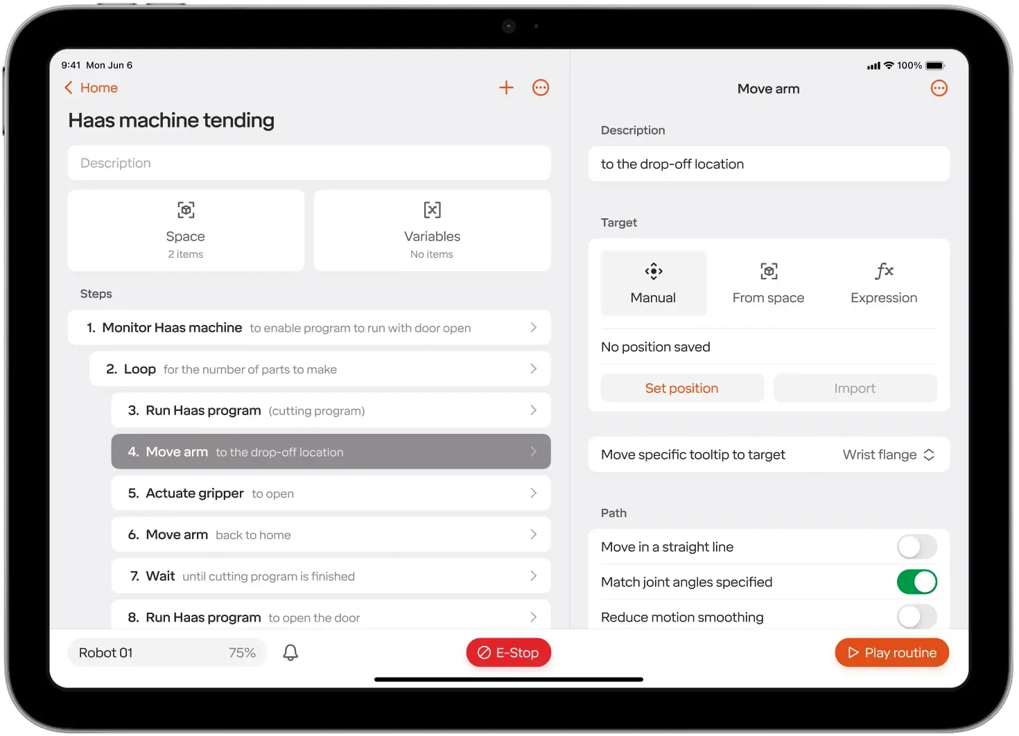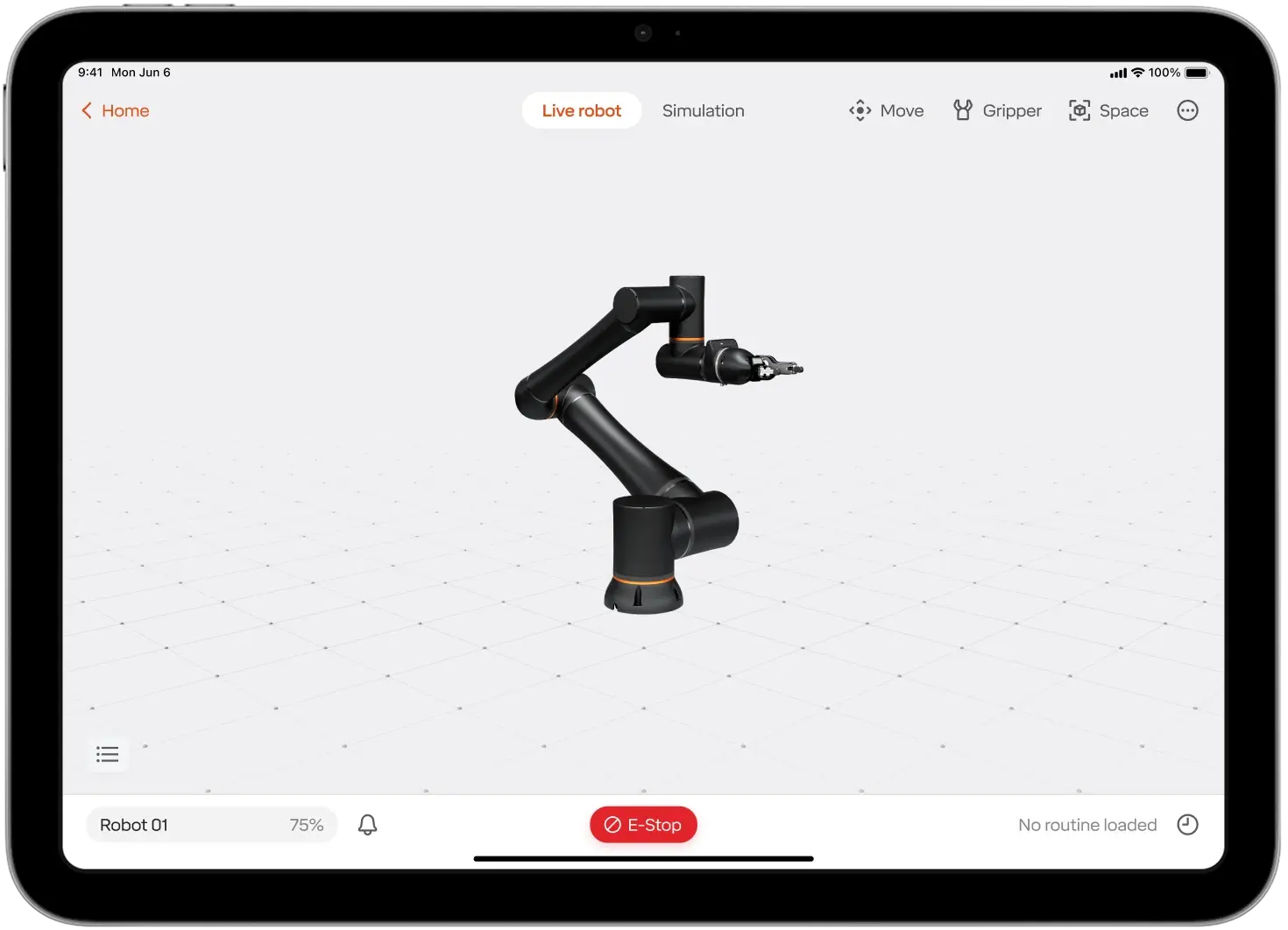 我們革命性的示教模式讓任何人都能教會機器人執行複雜任務。只需移動機械臂,它就能記住路徑。